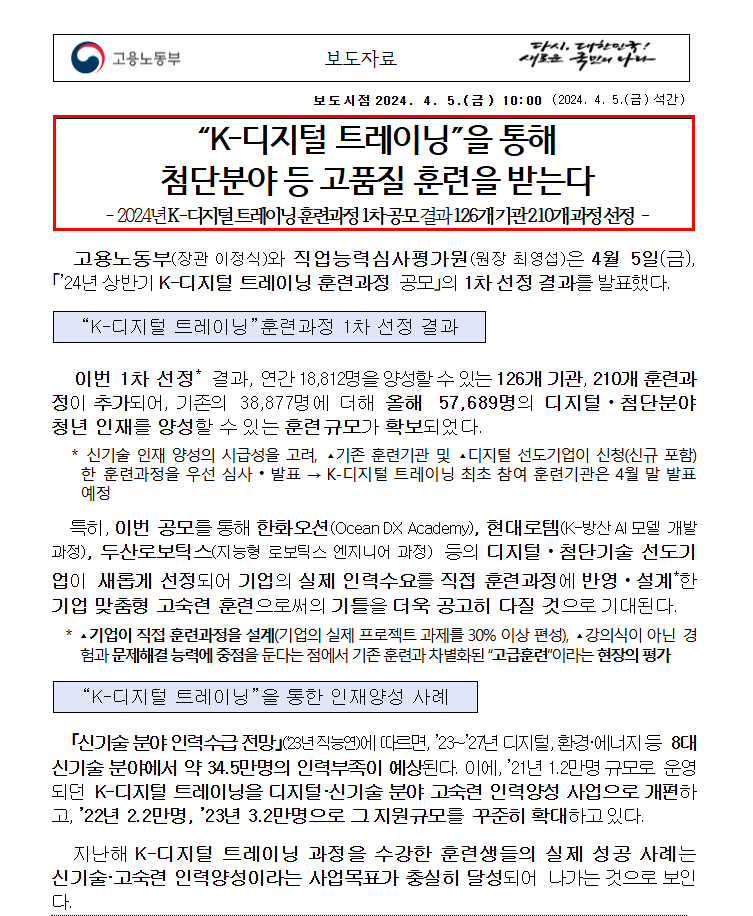 | 참여 기관 | 멋쟁이사자처럼, 모두의연구소, KH정보교육원 등 민간 훈련기관 및 디지털 선도기업 참여 |
